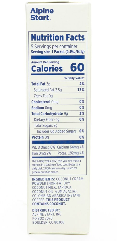 Treat yourself on your next morning mission with an Alpine Start Instant Coconut Creamer Latte. It combines Colombian Arabica coffee with non-dairy coconut creamer for a great-tasting latte on the go.