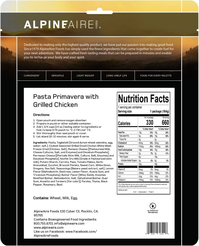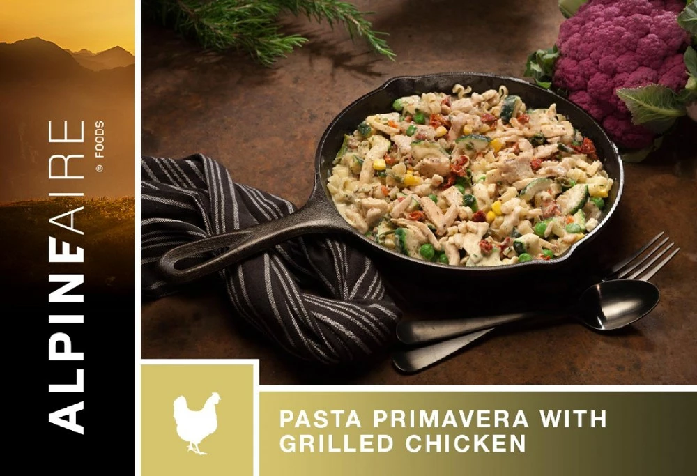 Fresh and zesty pasta with light cream sauce, grilled chicken and colorful veggies, AlpineAire Foods Pasta Primavera with Grilled Chicken is a delicious fuel for your adventure—and quick to prep, too.
